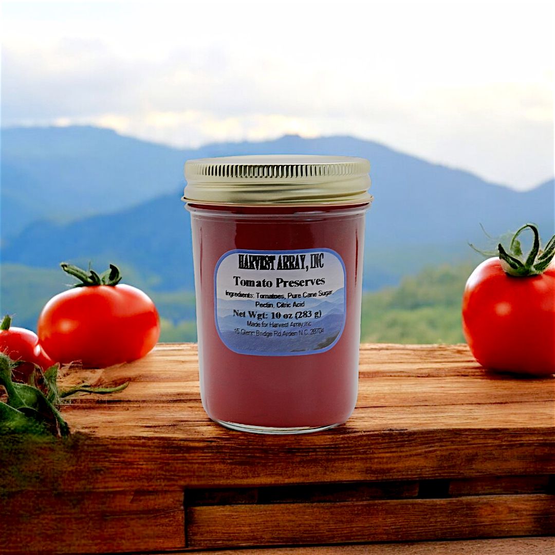 Our Tomato Preserves are made from locally sourced, vine-ripened tomatoes grown near the scenic mountains of Western North Carolina. Crafted in small batches, we ensure the delightful taste of the fruit is preserved in every jar (yes, tomatoes are fruit). Unlike the savory taste commonly associated with tomatoes, tomato preserves offer a sweet and tangy flavor profile that can be surprisingly delightful. The natural acidity of tomatoes combines with the sweetness of sugar to create a well-balanced flavor.